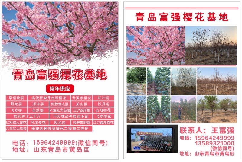 山東青島富強櫻花苗木基地歡迎您(王富強 13780680000、13589321000),青島富強品種櫻花基地常年供應:早櫻晚櫻,高低桿染井吉野櫻花,陽光櫻,河津櫻,紅粉佳人櫻,關山櫻,大漁櫻,松月櫻,飛寒櫻,白妙櫻,美利堅櫻,紅花染井吉野櫻,八重紅大島櫻,江滬彼岸櫻,小松乙女櫻,思川櫻,紅山櫻,雅櫻,獎章櫻,八重紅垂枝櫻等占地櫻花,承接各種園林綠化工程施工養護。歡迎新老客戶來我們這邊考察,購苗買苗服務。